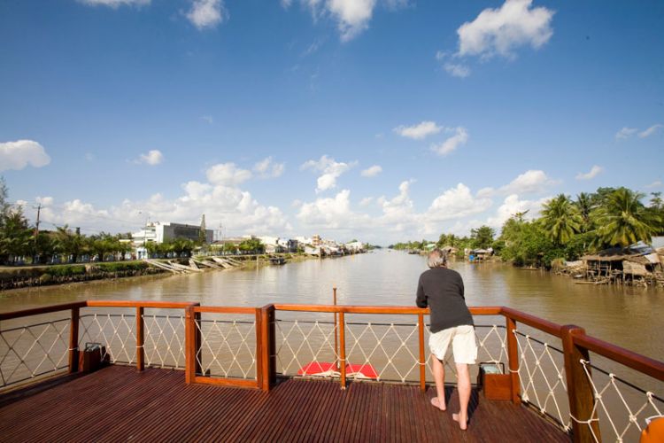 - Girando en el canal Nicolai, hacia los ríos Mang Thit y Co Chien. Descansa en la cubierta superior en un paisaje de campos de arroz, caña de azúcar, bosques en las orillas cercanas.